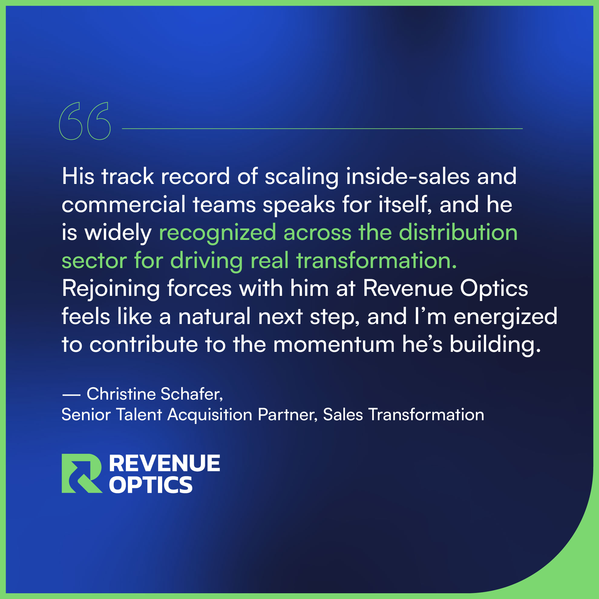 "I'm genuinely excited to work with Ali again," said Christine Schafer. "He brings a level of focus, energy, and execution discipline that is rare in this industry. His track record of scaling inside-sales and commercial teams speaks for itself, and he is widely recognized across the distribution sector for driving real transformation. Rejoining forces with him at Revenue Optics feels like a natural next step, and I'm energized to contribute to the momentum he's building."