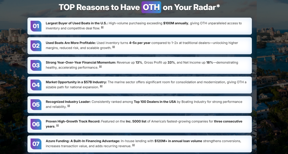 OTH's growth is further amplified by a capital-efficient expansion model built on strategic partnerships. Collaborations with Jefferson Beach Yacht Sales and CFR Yacht Sales in Puerto Rico provide immediate access to high-value markets across the Great Lakes, Florida, the Caribbean, and Latin America—without the burden of heavy fixed infrastructure.